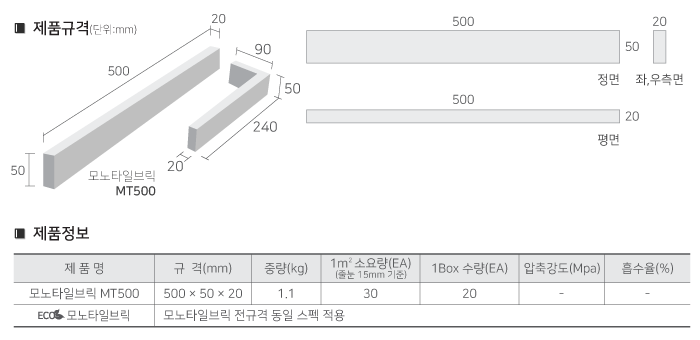 모노타일 MT500 | 500×50×20 | 1.1 | 30 | - | - | 20 |